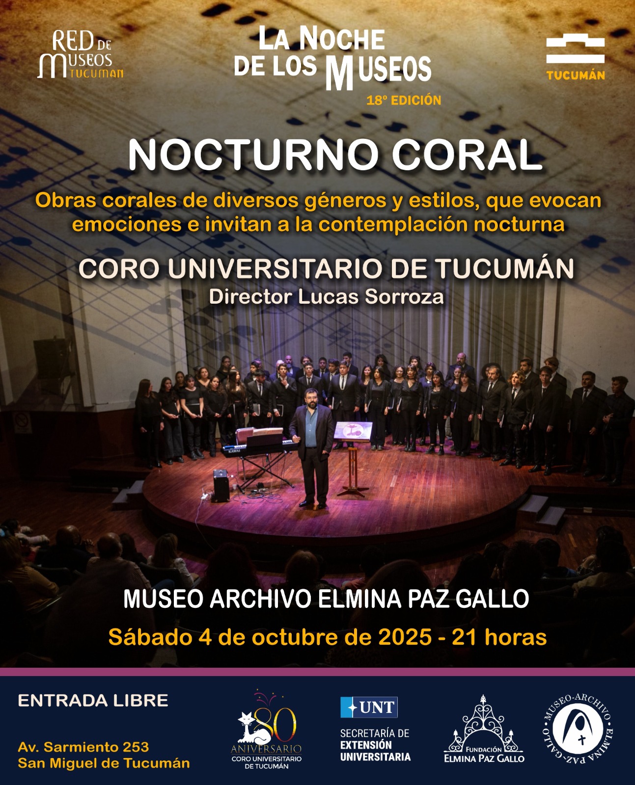 En el marco de la 18va. NOCHE DE LOS MUSEOS, el Museo Elmina Paz Gallo fue el anfitrión de un nutrido público que pudo disfrutar de la presentación del Coro Universitario, perteneciente a la UNT, que este año cumple su 80º aniversario. El coro, dirigido por el Mtro. Lucas Zorrosa, interpretó un repertorio de diversos autores y géneros, en una noche que se prestó para evocar recuerdos y poner las emociones en marcha cada vez que entonaban sus melodías.